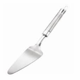 -A cake server with a black handle is a utensil that is used for cutting and serving slices of cake.